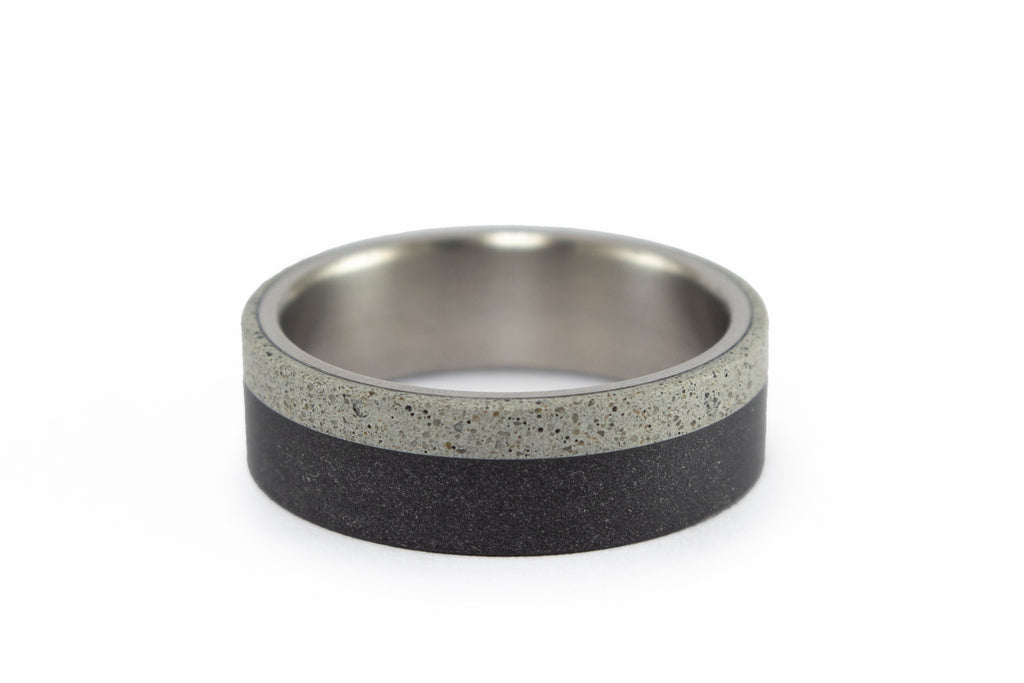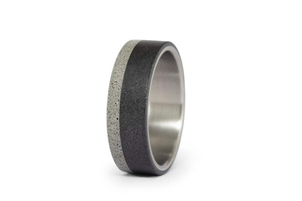 Anillo realizado en grafito y titanio, con un detalle lateral de concreto. De diseño moderno e industrial, este original anillo es extremadamente liviano y resistente.