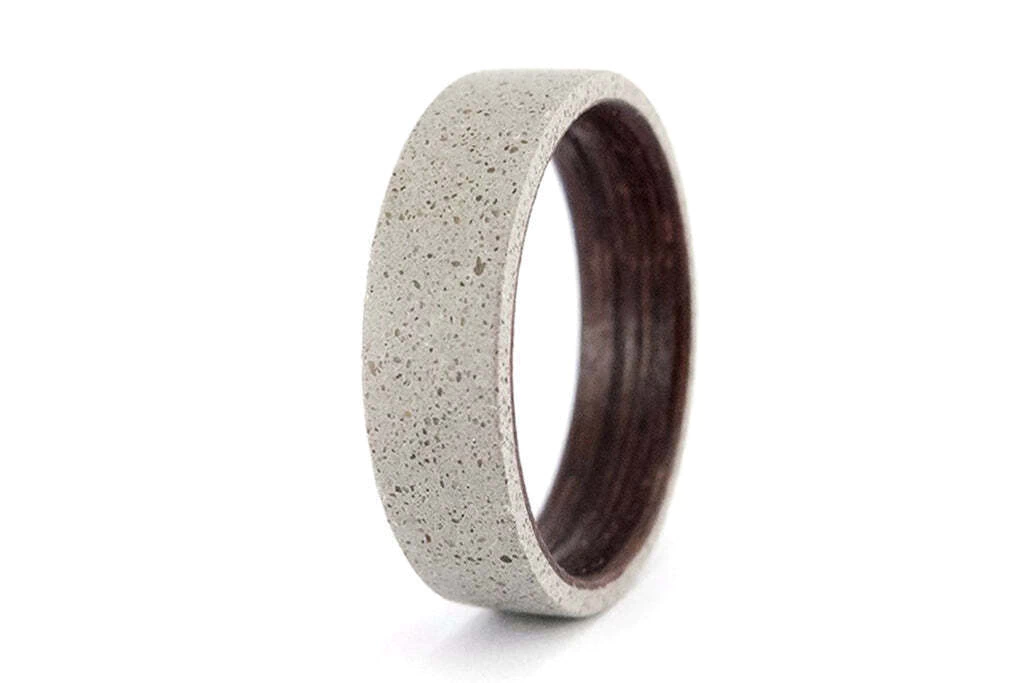 Este anillo combina dos materiales: el aspecto industrial del Concreto color gris y la nobleza de la Madera de Wengue curvada. Liviano y resistente, ésta pieza tiene un diseño moderno e natural.